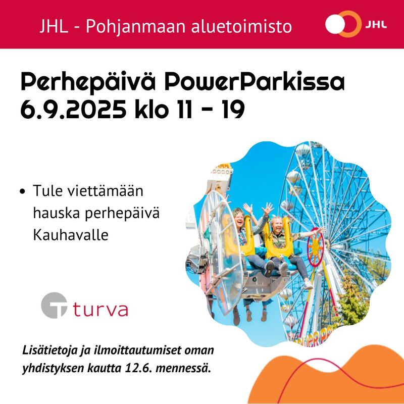 JHL:n Pohjanmaan alueen jäsenille perheineen. Puistossa tarjolla huvia ja hurjastelua sekä ainakin JHL:n aluetoimiston ja vakuutusyhtiö Turvan pisteet. Hinta: ranneke alle 130 cm 27 Eur ranneke yli 130 cm 35 Eur Sitovat ilmoittautumiset 12.6. mennessä yhdistyksen kotisivujen ilmoittautumislomakkeen kautta. Ilmoittautuessa ilmoita (lisätiedot) kaikki paikalle tulijat: